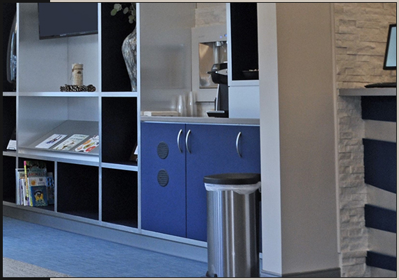 The Kelly's private office was moved from the front to the center, adjacent to the Ortho Bay. FX Design selected a royal blue woven glass pattern for their viewing window. The Ortho Bay was equipped with new Boyd Industries Dental chairs; each included an LED dental operatory light. Benches where strategically built-in around perimeter walls for waiting family members. We also developed a unique Steri-Lab room, adding an access door from inside the sterilization room with a pass-through door to the Ortho Bay. The brushing station was designed with a central high sink